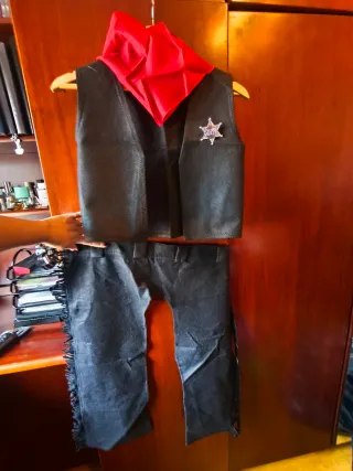 Conjunto de disfraz de sheriff. - Chaleco negro con insignia de sheriff. - Pañuelo rojo. - Pantalones negros con flecos. Usado 1 dia