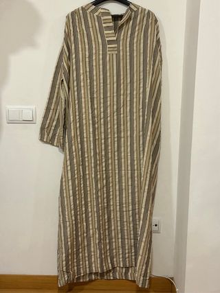Conjunto de disfraz de árabe para hombre. Incluye túnica y turbante. - Túnica de rayas verticales en tonos beige, marrón y gris. - Cuello redondo con abertura. - Turbante de tela color crema con detalle de cuerda trenzada en gris y blanco.