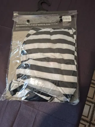 Disfraz de ladrón con rayas blancas y negras, incluye gorro y antifaz. - Diseño de rayas icónico. - Gorro y antifaz a juego.