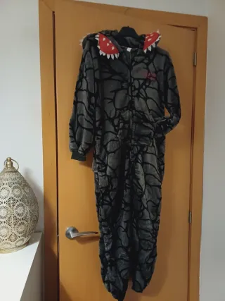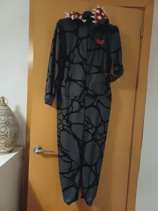 Este pijama/disfraz con capucha es perfecto para los fans de Stranger Things. Su diseño inspirado en el Demogorgon lo hace ideal tanto para dormir como para usar como disfraz. - Diseño de Demogorgon con detalles en la capucha. - Tejido de terciopelo suave y cómodo. - Cremallera frontal para facilitar su uso. - Cremallera en la zona del culete también para facilitar su uso. Se puede usar de 10 a 12 años aproximadamente. 1,40 cm. Compramos para una función de teatro y éste se quedó sin estrenar. Precio no negociable.