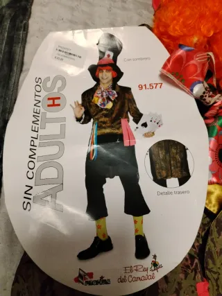 Disfraz de sombrerero loco para adulto. - Incluye sombrero, peluca naranja, chaqueta y pantalón. - Detalles de cintas de colores en la chaqueta. - Puños de encaje en la chaqueta.