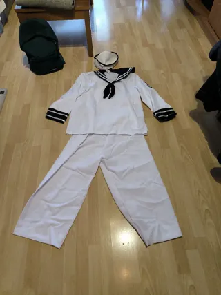 Conjunto de disfraz de marinero. - Camisa con cuello y detalles en negro. - Pantalón a juego. - Gorro de marinero. Solo se ha usado una vez. Solo envíos.