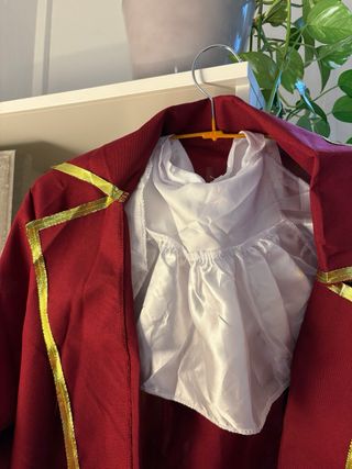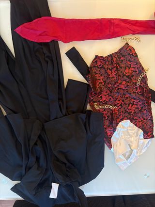 Conjunto de disfraz inspirado en Drácula. - Parte superior con estampado de dragones en rojo y negro. - Cadena dorada decorativa. - traje negros. - pañuelo rojo