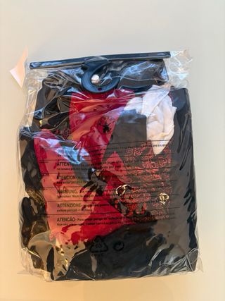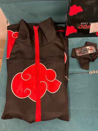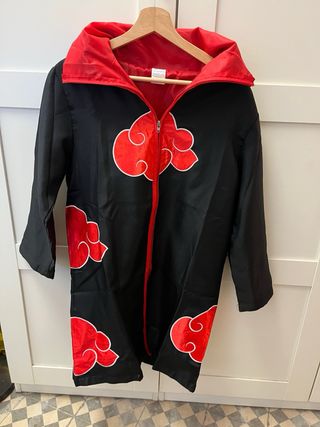 Disfraz inspirado en el anime Naruto, con el icónico diseño de Akatsuki. Incluye el atuendo principal y accesorios. - Diseño de nubes rojas sobre fondo negro. - Cierre de cremallera frontal. - Incluye banda ninja y collar. - Talla XS para un niño de 10 años aprox