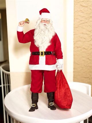 Disfraz de Papa Noel Premiere en talla XL. Completo para celebrar la Navidad. - Incluye: Sombrero, chaqueta, cinturón, guantes, pantalones, cubrebotas, gafas, peluca, barba, bolsa de regalo dorada y cascabel. - Talla: XL.