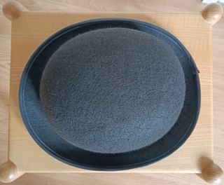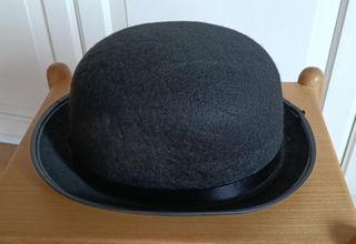 Sombrero tipo bombín negro para disfraz. Es de un material que parece mezcla de fieltro y cartón