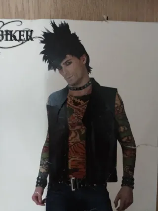 Disfraz estilo punky motero con estampado de tatuajes. - Diseño llamativo y original. - Incluye camiseta de manga larga con tatuajes. - Chaleco negro. - Pantalones vaqueros. - Cinturón con tachuelas. - Collar con pinchos. - Pulseras con pinchos. - Peluca de cresta.