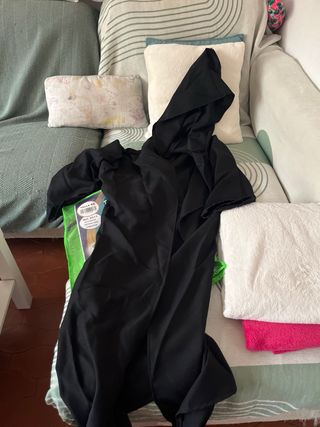 Lote de accesorios variados para disfraces.talla de la tela negra largo,1,98,ancho1,55 - Gorro verde. - Cinturón dorado brillante. - Collar de flecos amarillo y blanco. - Pañuelo rojo. - Tocado blanco con cruz roja. - Tira de tela blanca.