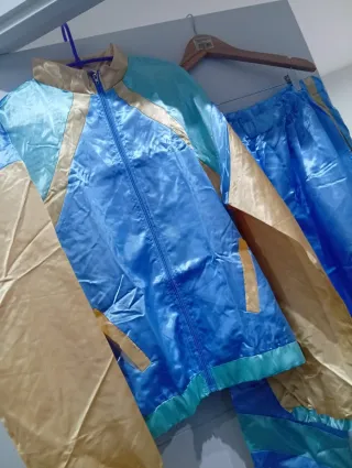Conjunto de chándal con un diseño llamativo y colores vibrantes. - Chaqueta con cremallera frontal. - Pantalones con cintura elástica. - Paneles de color dorado y azul claro.