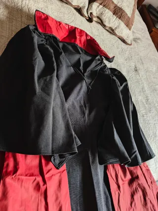Completo disfraz de Drácula para adultos. - Capa larga negra con forro rojo. - Chaleco con estampado damasco en rojo y detalles dorados. - Cuello blanco con cadena dorada. - Pantalón largo negro para poner sobre otros. Usado una vez