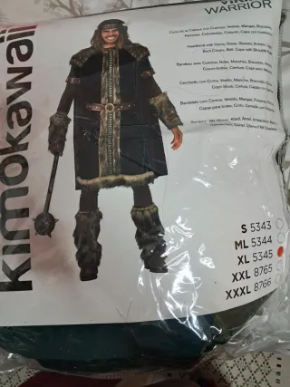 Disfraz completo de guerrero vikingo, ideal para fiestas temáticas o Halloween. Solo se ha usado una vez. - Incluye: diadema, vestido, mangas, cubrebotas y cinturón. - Diseño inspirado en la cultura vikinga.