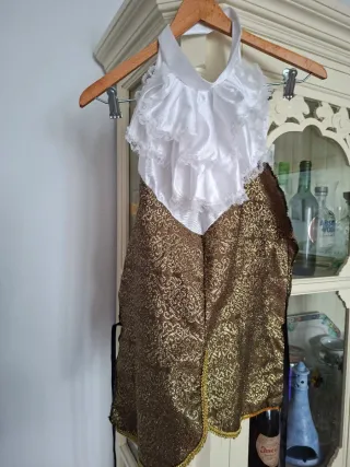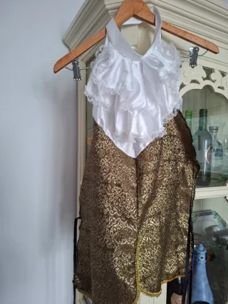 Este disfraz cuenta con una pechera con volantes y un diseño llamativo. - Pechera con volantes blancos. - Parte inferior con estampado dorado. - Talla única. Lazada de arriba mide 51, la de abajo 56, de laso a lado.Largo 68 cm.Laa cintas negras ,miden rodas 46 cm