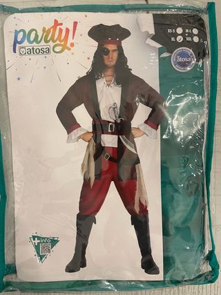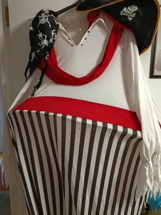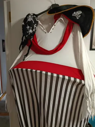 Vendo pack de disfraces de pirata. Hombre talla L Mujer talla S Niño talla hasta 12 meses. Además incluyó las espadas.