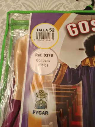 Disfraz de gospel en talla 52, con un diseño en morado y dorado. - Incluye túnica. - Marca FYCAR.