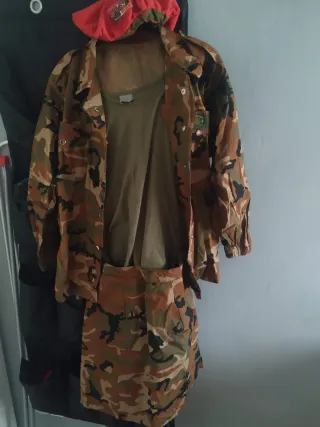 Conjunto de disfraz militar con estampado de camuflaje. Está hecho en casa. Incluye falda, camisa, camiseta y gorro. La talla es una 40 aprox. Dejo fotos con medidas