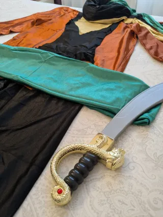 Disfraz adulto de príncipe árabe (talla única). Incluye varias piezas para un look completo. Incluye: turbanteacolchado para el velo en la cabeza, túnica naranja, pantalones anchos negros y espada. Se ha utilizado en dos ocasiones. ⚠️el precio no se modifica 🤝trato en mano. 🚚también hago envíos. ✅Vendedor serio, invito a ver las valoraciones de mi perfil.
