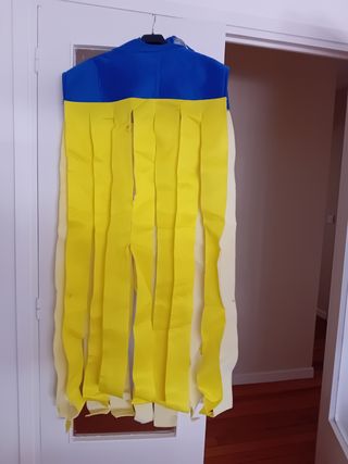 Disfraz divertido con diseño de lápiz. Con su bolsa original para guardarlo. Alto 1,45, largo, es para adulto Ancho 0,46 - Parte superior con estampado de madera. - Cuerpo principal con rayas negras y amarillas. - Detalle de goma de borrar rosa en la parte inferior. - Inscripción PENCIL No. 1 en un lateral. Me costó 30€ y me lo he puesto en una ocasión. Está perfecto. Ideal para Navidad y Carnaval.