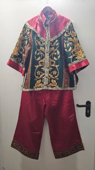 Conjunto de dos piezas con un diseño inspirado en la vestimenta tradicional china. - Chaqueta con estampado floral y detalles dorados. - Pantalón ancho de color liso. Talla Hombre 42 a 46 Talla mujer 36 a 40 Talla niña 8 a 10 años HECHOS A MANO