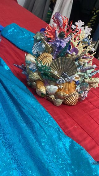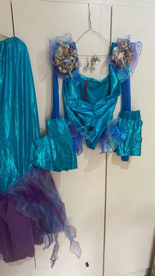 Este disfraz de sirena es ideal para fiestas temáticas o eventos especiales. El diseño brillante y los detalles marinos le dan un toque mágico. - Adornado con conchas marinas en los hombros. - Incluye mangas largas y falda con volantes. - Tejido con acabado brillante. Pendientes anillo abalorios Hecho y pintado a mano .