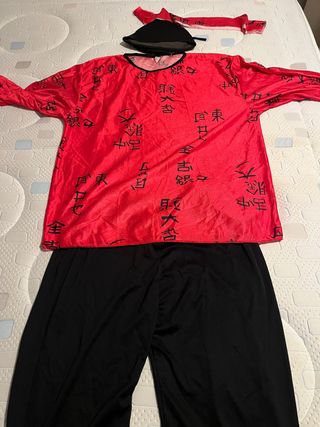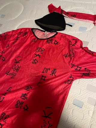 Disfraz de estilo oriental para adulto. - Conjunto de dos piezas: túnica y pantalón. - Túnica roja con estampado de caracteres orientales en negro. - Pantalón negro. - Incluye gorro y cinta para la cabeza.