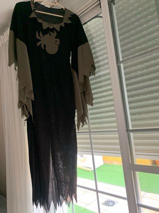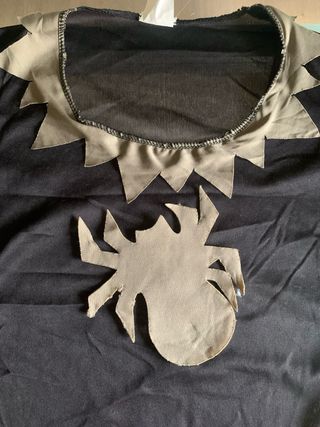 Disfraz de araña con un diseño llamativo. - Adorno de araña aplicado en la parte frontal. - Cuello con detalles en forma de picos. - Mangas originales. - Se adapta a todo tipo de cuerpos. - Muy cómodo. - 1,10cm de axilas hasta debajo. -Usado solo una vez.