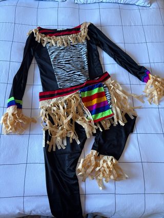 Disfraz con estampado de cebra y detalles tribales. - Mangas largas. - Adornos de flecos. - Cinturón con diseño de rayas de colores.