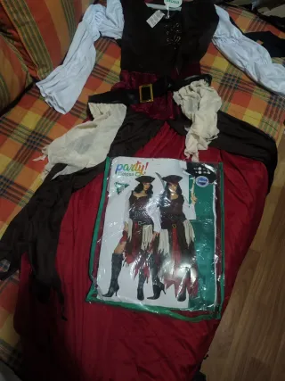 Disfraz de pirata corsario, ideal para fiestas temáticas o Carnaval. Este conjunto te transportará a la época de los bucaneros. - Diseño de corsario con múltiples capas. - Incluye sombrero y cinturón. - Mangas abullonadas.