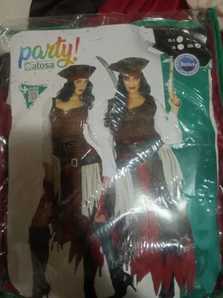 Disfraz de pirata corsario con detalles llamativos. - Diseño de dos piezas. - Mangas blancas abullonadas. - Cinturón con hebilla dorada. - Falda con volantes y aspecto desgastado.