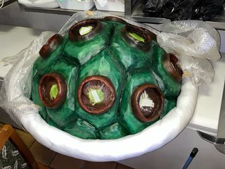 Concha de disfraz inspirada en Bowser. - Diseño detallado con múltiples protuberancias. - Tonos verdes y marrones.