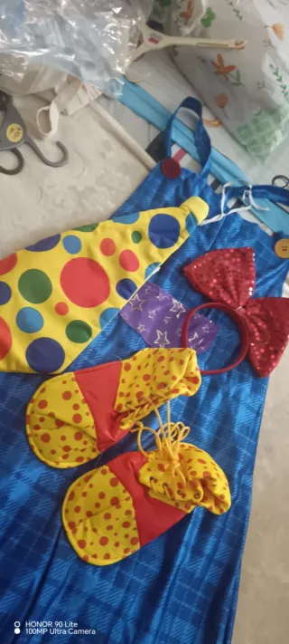 Disfraz de payaso completo para adulto. - Mono azul con cuadros y bolsillos delanteros morado. - Zapatos payaso de tela talla M - Diadema con lazo. - Corbata de lunares. - Estrellas y parches decorativos.