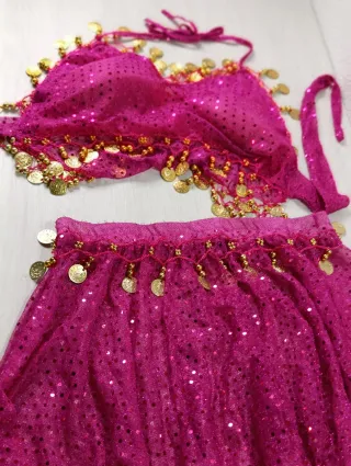Conjunto de dos piezas para danza o disfraz. - Top con detalles de lentejuelas y monedas doradas. - Falda a juego con cinturilla elástica y adornos de monedas.