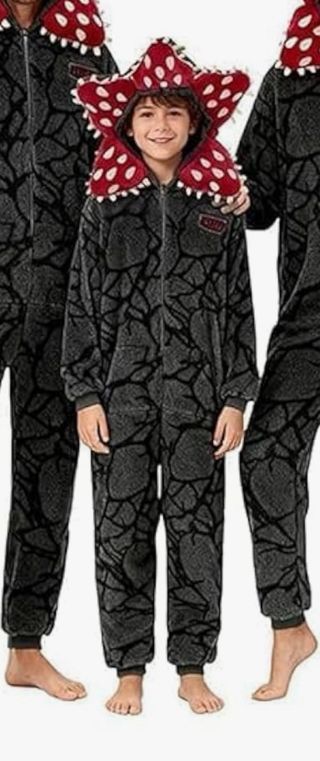 Pijama o disfraz con diseño de Demogorgon. - Estampado de piedra gris con detalles negros. - Capucha con forma de flor de Demogorgon en rojo y blanco. - Cierre de cremallera frontal.
