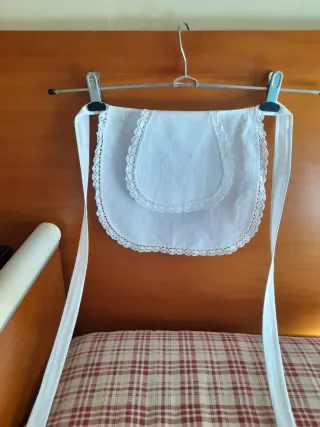 Delantal blanco con puntilla alrededor. Sirve para niñas y mayores. 43 cm de largo con peto 26 cm largo sin peto 29,5 cm ancho en la falda