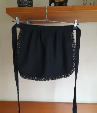 Este delantal negro es un accesorio ideal para completar un disfraz. Cuenta con un bonito detalle de encaje. Sirve para niñas y mayores. Medidas en fotografía: 36 cm largo 43 cm ancho