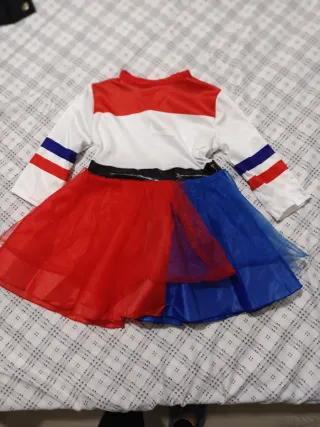 Disfraz de animadora con detalles deportivos. - Cuerpo superior rojo con cuello blanco. - Falda blanca con cintas rojas. - Detalle de la letra A en el pecho. Talla 5-6 (no tiene etiqueta pero por el tamaño)