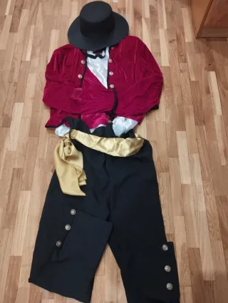 Disfraz para adulto, a juego con el de niño (también publicado) - Tejido de terciopelo rojo con camisa y chaleco unido .-Pantalón negro con botones dorados y fajín dorado. El pantalón tiene bolsillo interior. - Sombrero negro