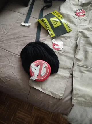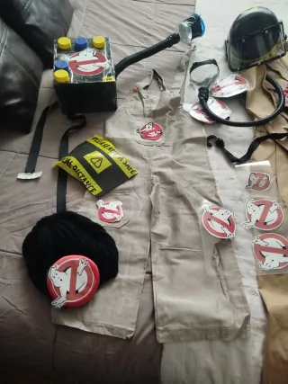 Completo disfraz de Cazafantasmas, ideal para niños y adultos. Incluye varios accesorios para recrear el icónico traje. - Mono de trabajo en color beige. - Mochila de protones con manguera. - Pegatinas del logo de Cazafantasmas. - Gorra negra. - Pin de Cazafantasmas. - Cinturón de seguridad con señal de advertencia. Hay dos juegos niño/a 4/6 años Adulta con talla XS Tengo otro sin publicar para adolescente Talla 12/14 años Cada juego 15 euros y los dos 25