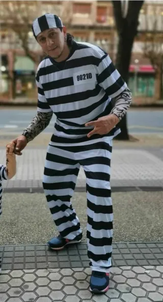 -No envio- Disfraz de presidiario con estampado de rayas blancas y negras. Incluye camiseta y pantalón. - Talla S/M - Diseño de rayas clásico. -disfraz preso -disfraz adulto -disfraz niño -disfraz presidiario -disfraz
