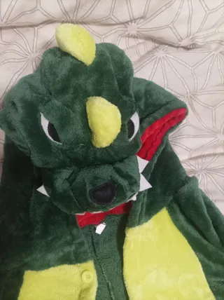 Disfraz de dragón con capucha, ideal para carnaval o fiestas. Talla adulto M-L mujer Talla niño 6-8 años - Diseño de dragón con detalles. - Cierre frontal con botones. - Material suave y cómodo.