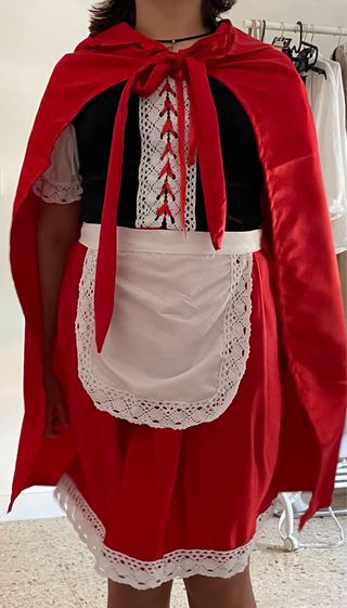 Disfraz de Caperucita Roja, ideal para carnavales o fiestas. 1) Capa roja con capucha. 2) Vestido: Corpiño negro con cordones, mangas blancas de encaje, falda roja con ribete de encaje. 3) Delantal blanco con ribete de encaje. 4) Diadema roja con lazo. Apto para niñas de 10 años en adelante, mujeres jóvenes o adultas. La calidad es perfecta, usada una vez para una actuación en el escenario.
