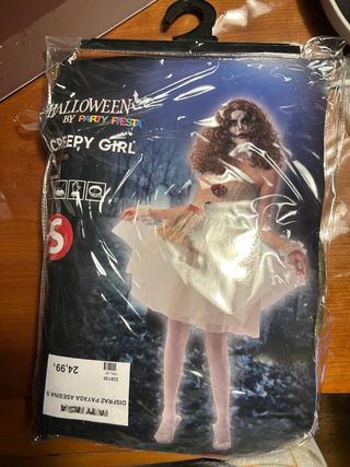 Disfraz de Halloween para niña, modelo Creepy Girl. - Incluye vestido y cinta para el cuello. - Diseño de payasa asesina. - Sin estrenar pero la bolsa se encuentra un poco dañada.