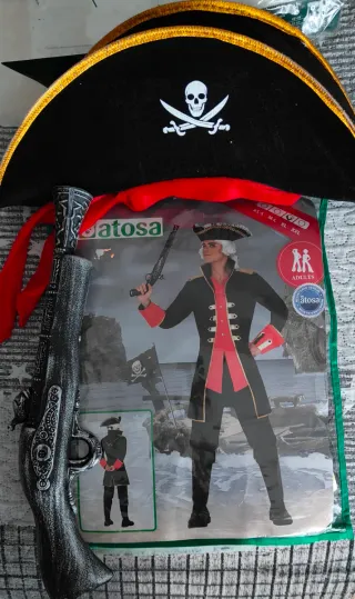 Disfraz de pirata para hombre, talla XL. Usado una vez. - Diseño con calavera y espadas cruzadas en el sombrero. - Chaqueta con detalles dorados y puños rojos. - Incluye un trabuco de juguete. Tengo también el de niño 10-12 a juego y uno de chica talla M. Puedes verlos en mi perfil