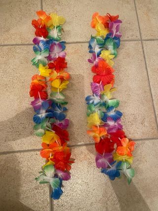 Conjunto de accesorios para fiestas temáticas hawaianas o disfraces. Puede ser un disfraz tanto para adultos como para niños. - 2 faldas de tiras multicolor. - 2 collares de flores. - 2 pulseras de flores