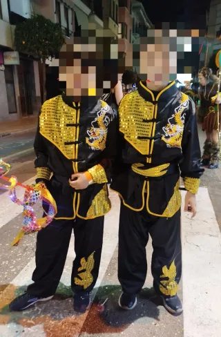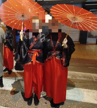 Conjunto de disfraces inspirados en la cultura china, ideal para fiestas o eventos. - Diseño del disfraz de mujer con detalles en rojo y negro.Los de niños negros con lentejuelas doradas o azul con lentejuelas doradas. - Tallas mujer L y XL (tallan pequeños) negro y rojo.20€ accesorios incluidos: sombrilla con luces y 2 palos para pelo. -Tallas niños 9-10 años, dispongo de 2 negros y 1 azul.10€ cada uno
