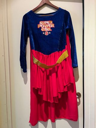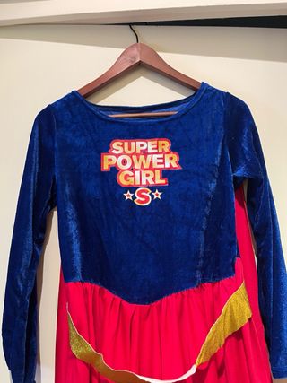 Disfraz de superhéroe para niña con diseño inspirado en Supergirl. - Parte superior azul de terciopelo con estampado SUPER POWER GIRL. - Falda roja con volantes y cinturón dorado. - Mangas largas.