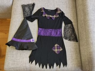 Disfraz de brujita para niña, súper bonito. Queda ideal a una niña delgadita. puede valer fácilmente desde los tres o cuatro, y hasta los hasta los siete años si la niña es delgada. Incluye gorro con goma. Medidas en las fotos.