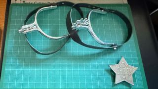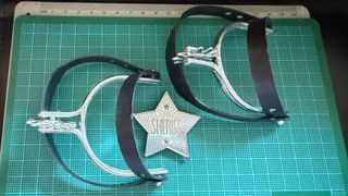 Conjunto de disfraz de sheriff que incluye espuelas y una estrella. Todo es de plástico - Dos espuelas plateadas con correas negras. - Una estrella plateada con la palabra SHERIFF grabada. No tiene alfiler para el enganche, va con una solapa de plástico - Ideal como complemento de disfraz de Sheriff para niños