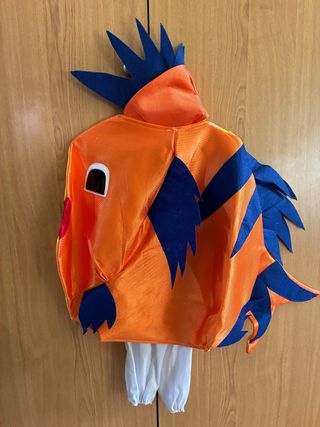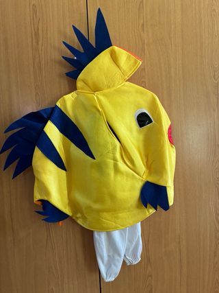 Disfraz de pez para niños, ideal para fiestas o eventos. - Diseño llamativo en naranja y azul. - Incluye capucha con detalles. - Pantalón blanco a juego.