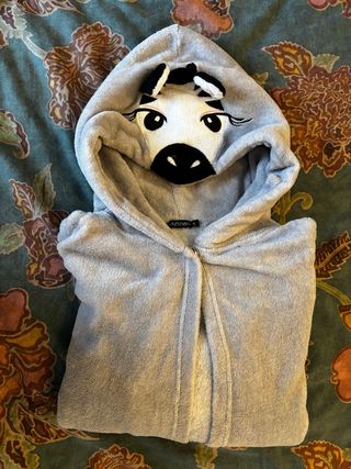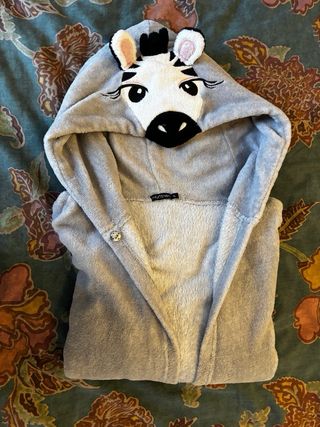 Bata polar muy suave con diseño de cebra. - Capucha con detalles de cebra. Capa poncho muy cómodo para estar en casa. - Cierre con botón en el cuello. - Tacto muy agradable. Sirve como Bata o disfraz. No pesa nada. Usado en un post operatorio xq no podía usar nada con mangas. Talla XL. Vale para todas las edades y tallas. Yo soy alta. Largo frente 89, largo espalda 100 cms.