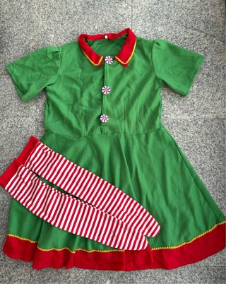 Disfraz de elfo para mujer, ideal para celebraciones. - Vestido verde con detalles rojos y amarillos. - Tres botones decorativos en la parte frontal. - Incluye calcetines a rayas rojas y blancas. - incluye gorro a juego y cinturón elástico - Tela cómoda y muy calentita